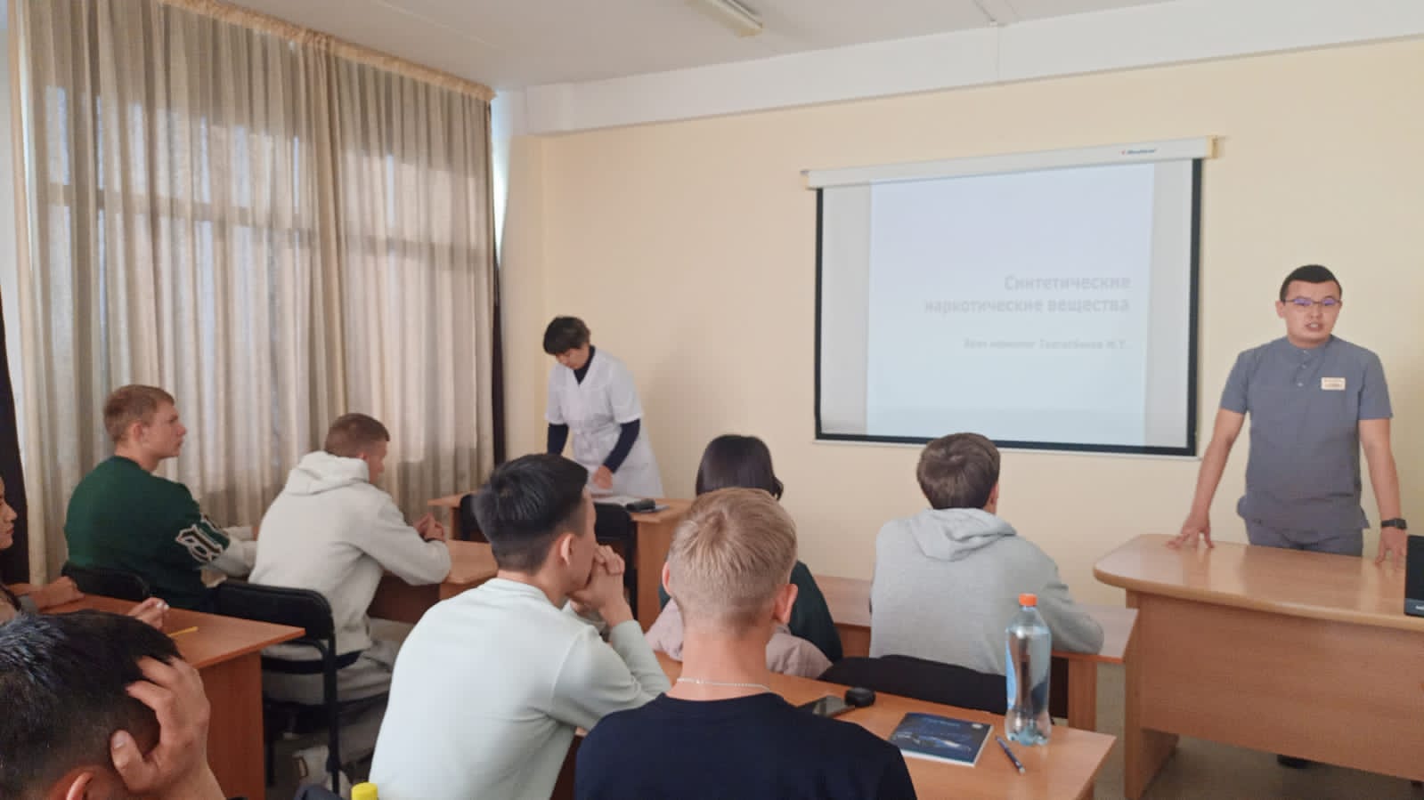 Врач- нарколог Талгатбеков М.Т. поделился методами профилактики и рассказали о последствиях наркомании для здоровья и общества. Акцент был сделан на важности информационной осведомленности среди студентов и необходимости взаимодействия молодежных общественных организаций.